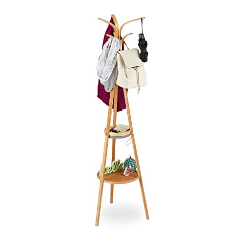 Relaxdays Garderobenständer, moderner Jackenständer aus Bambus, 2 Ablagen, 6 Haken, Baum Design, 178 x 50 x 50 cm, natur